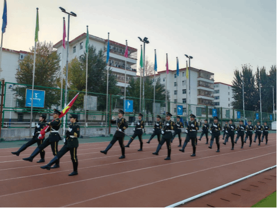 早晨7时整,升旗仪式正式开始。迎着春日的骄阳,校国旗班的护旗手们着装整齐、步伐矫健,护送鲜艳的五星红旗走向国旗台。伴随着嘹亮的《义勇军进行曲》,全场师生庄严肃立,向国旗敬礼,五星红旗冉冉升起,迎风飘扬,雄壮的国歌声响彻校园上空。
