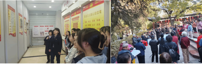 在起风街社区,社区书记、主任带领大家参观了起风街社区的办公场所、居民活动中心、社区卫生服务站,着重介绍了起风街社区的“白鲜花法官工作室”、“青春永驻”志愿服务项目、“李红老师社区治理与社会名家工作室”和省市图书馆联网千余本图书的居民阅览室等,并结合起风街的历史对太原古城文化进行了讲解。